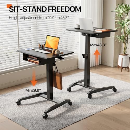 Experience comfort and flexibility with our rolling standing desk. Effortlessly adjust its height from 29.9” to 43.3” using the lift handle, ensuring you find the perfect ergonomic position. The spacious 27.3" x 20.4" desktop accommodates any laptop and mouse setup, and includes a convenient hook for your bag or earphones. This sturdy workstation supports up to 22lbs.